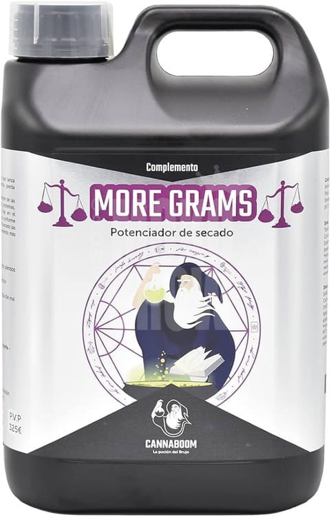 MORE GRAMS to unikalna formuła na świecie: sprawia, że rośliny tracą mniej na wadze w procesie suszenia. Działa poprzez zwiększenie retencji wody w kwiatach, nawadnia przestrzeń między włóknami i pozwala na przyswojenie tej bogatej w składniki odżywcze wody w końcowej fazie kwitnienia. Masa organiczna wzrośnie tuż przed cięciem, dzięki czemu kwiat straci 10% / 20% mniej na wadze podczas fazy suszenia.