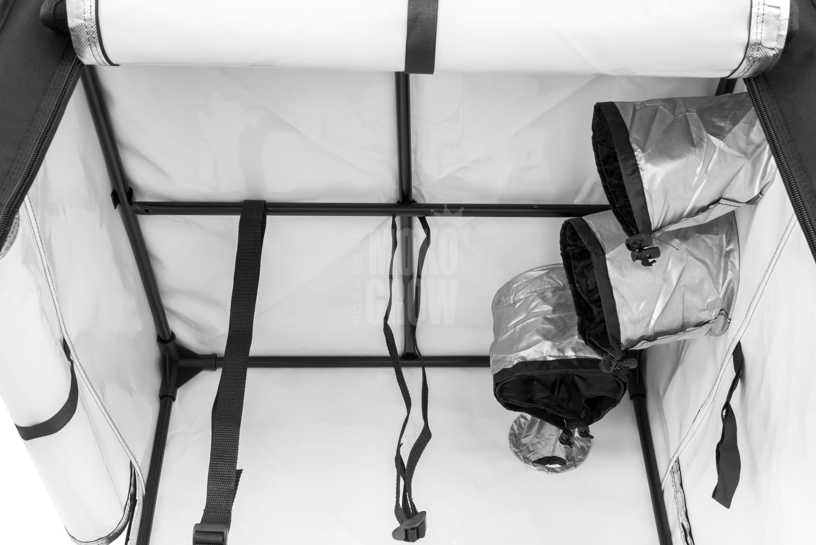 - Namiot wykonany z odbijającego światło materiału - folii white mylar 600d (95% odbijalności)