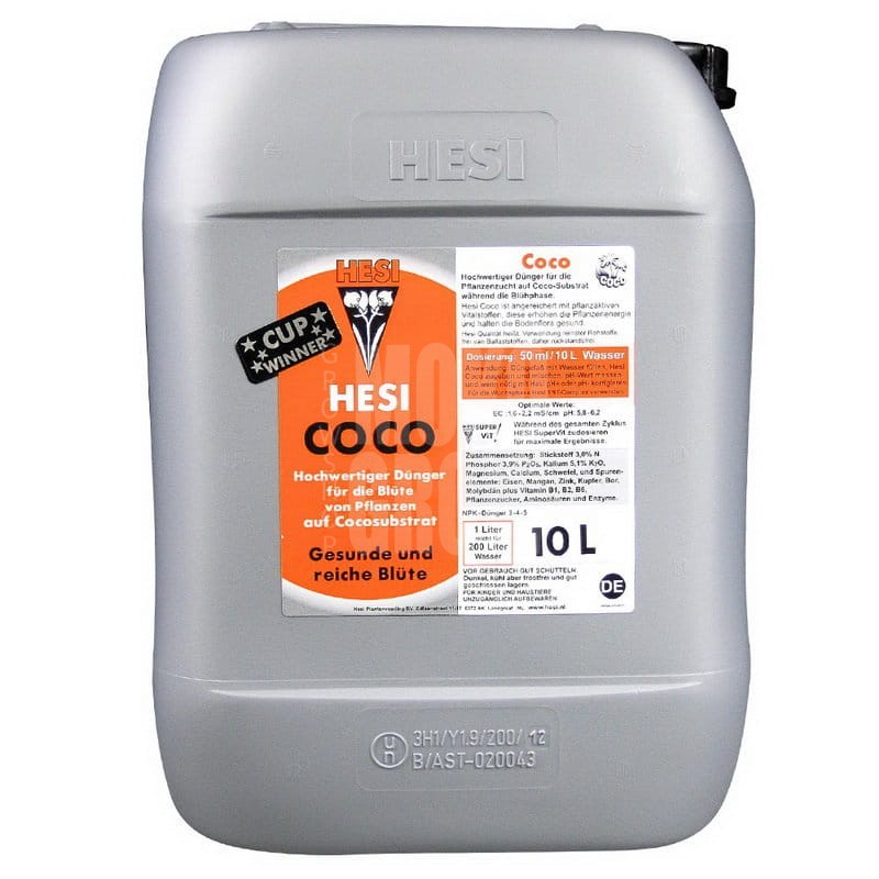 Hesi Coco dodatkiem do kwitnienia w substancjach coco. Jak wszystkie dodatki HESI, Hesi Coco jest zrównoważony dzięki kompleksowi substancji wiążących i jest on wolny od niepotrzebnych obciążeń.Hesi Coco nie jest nawozem A & B, składniki A+B są połączone w jednej butelce. Hesi Coco zawiera zarówno azot organiczny jak i mineralny. Wszystkie mikroelementy zostały zrównoważone w ochronnych związkach i wzbogacone witaminami oraz innymi substancjami odżywczymi ważnymi dla kwitnienia. W ten sposób uzyskujemy w systemie perfekcyjną równowagę i gwarantuje szybką odbudowę zdrowej mikroflory. Możliwe, że EC w Hesi Coco jest nieco niższe niż w innych dodatkach coco, ponieważ nie dodano soli, która podniosłaby tylko wartość EC, nie mając jakichkolwiek wartości odżywczych dla rośliny. Dlatego też ważne jest, by nie przekroczyć maksymalnej dawki 50 ml / 10 L.