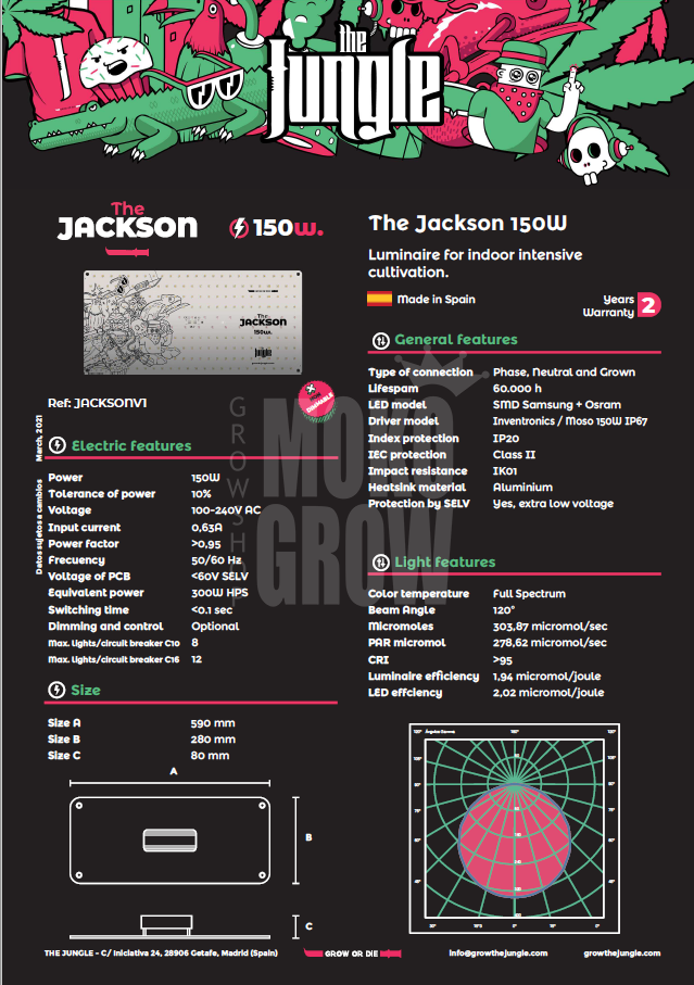 Jackson to światło LED o pełnym spektrum specjalnie opracowane do uprawy w pomieszczeniach. Ta płyta kwantowa o niskim zużyciu i wysokiej wydajności jest produkowana z nowego typu diodami LED firmy Samsung o długiej żywotności do 50 000 godzin.