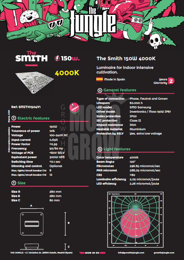 Smith by Grow The Jungle to lampa LED przyspieszająca wzrost roślin, utrzymująca rośliny mateczne i klony roślin. Poprawia wydajność rośliny w fazie wegetatywnej lub w fazie kwitnienia, redukując przy tym ciepło i poprawiając wydajność, oprócz współczynnika wzrostu. Smith został opracowany przez Grow The Jungle jako światło uzupełniające dla fazy wzrostu roślin matecznych, sadzonek i klonów.